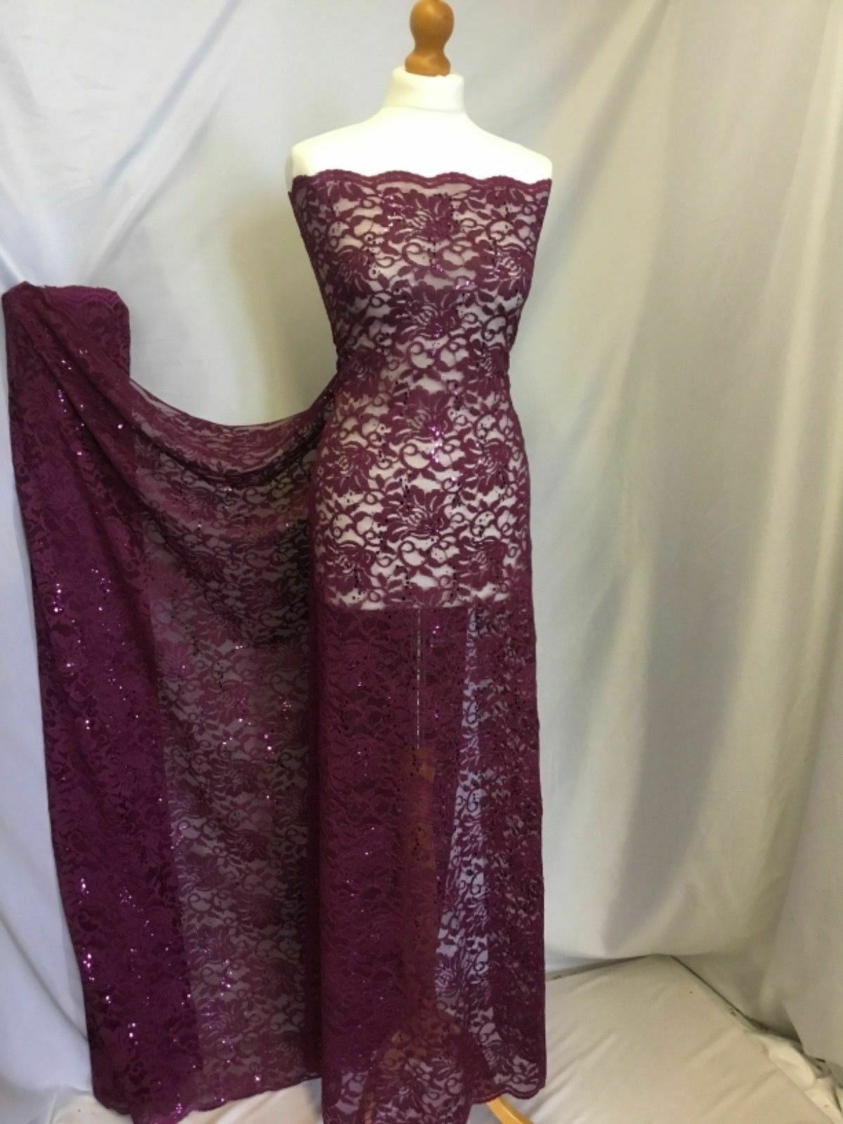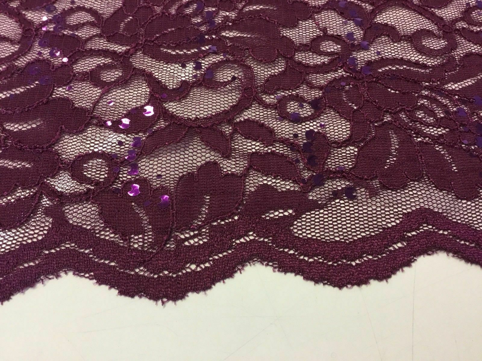 NEW Wine Stretch Floral Sequins Corded Lace Double Scalloped Border Fabric Bling