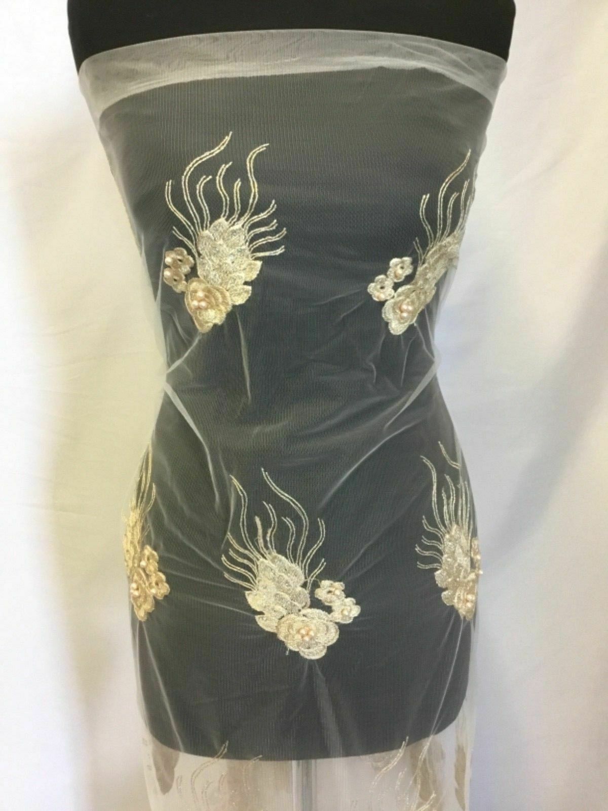 NEW Designer High Class Ivory Gold Pearl Paisley Border Lace Fabric 50” 129 cm