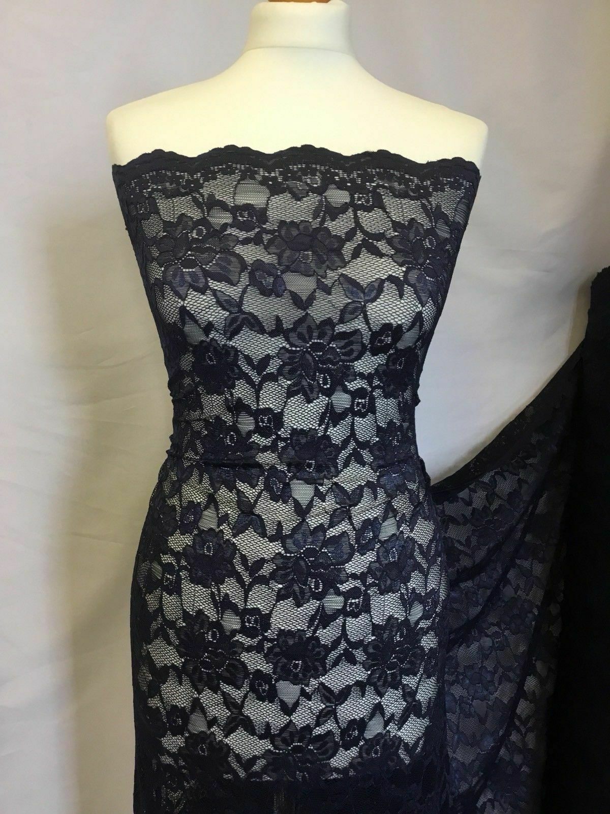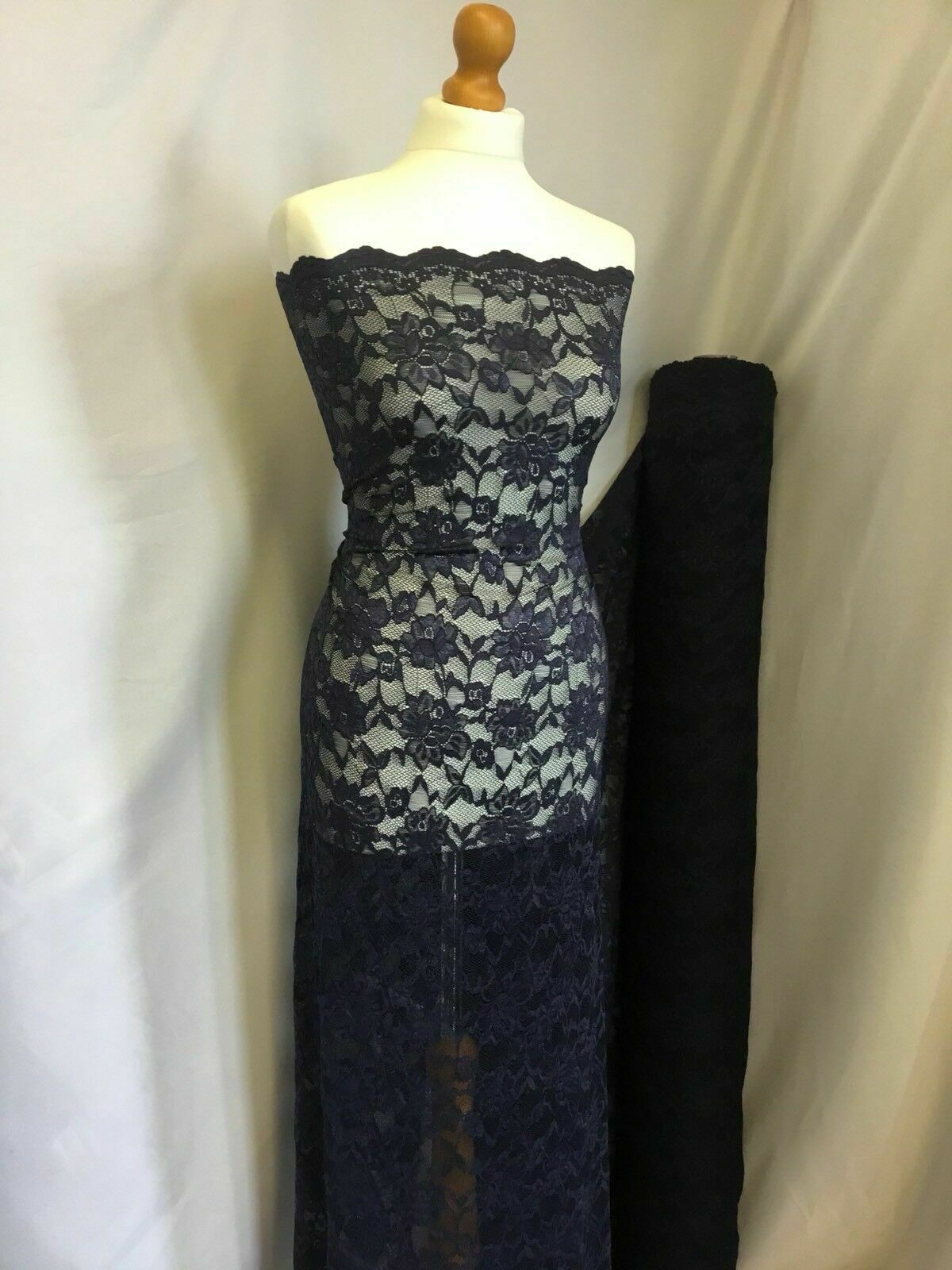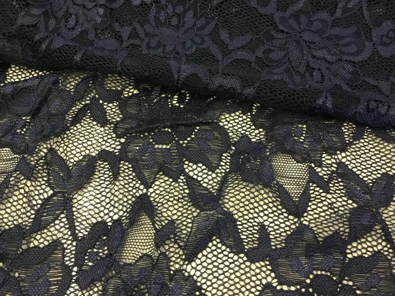 NEW Designer Navy 4 Way Stretch Net Floral Lace Double Scalloped Border Fabric