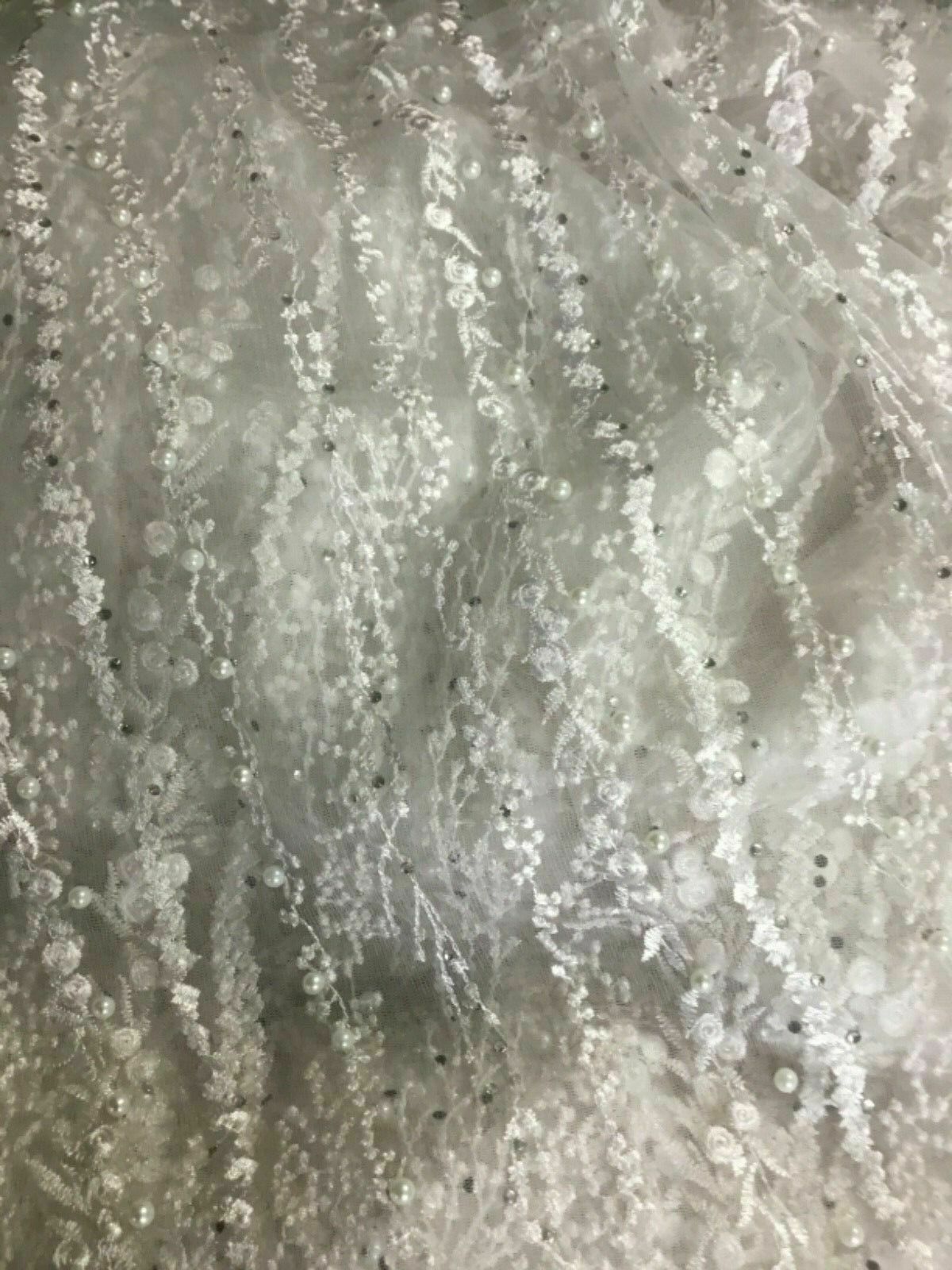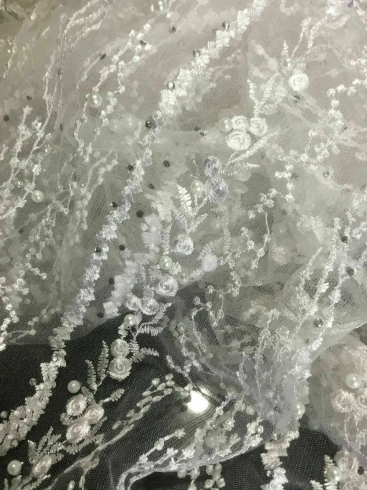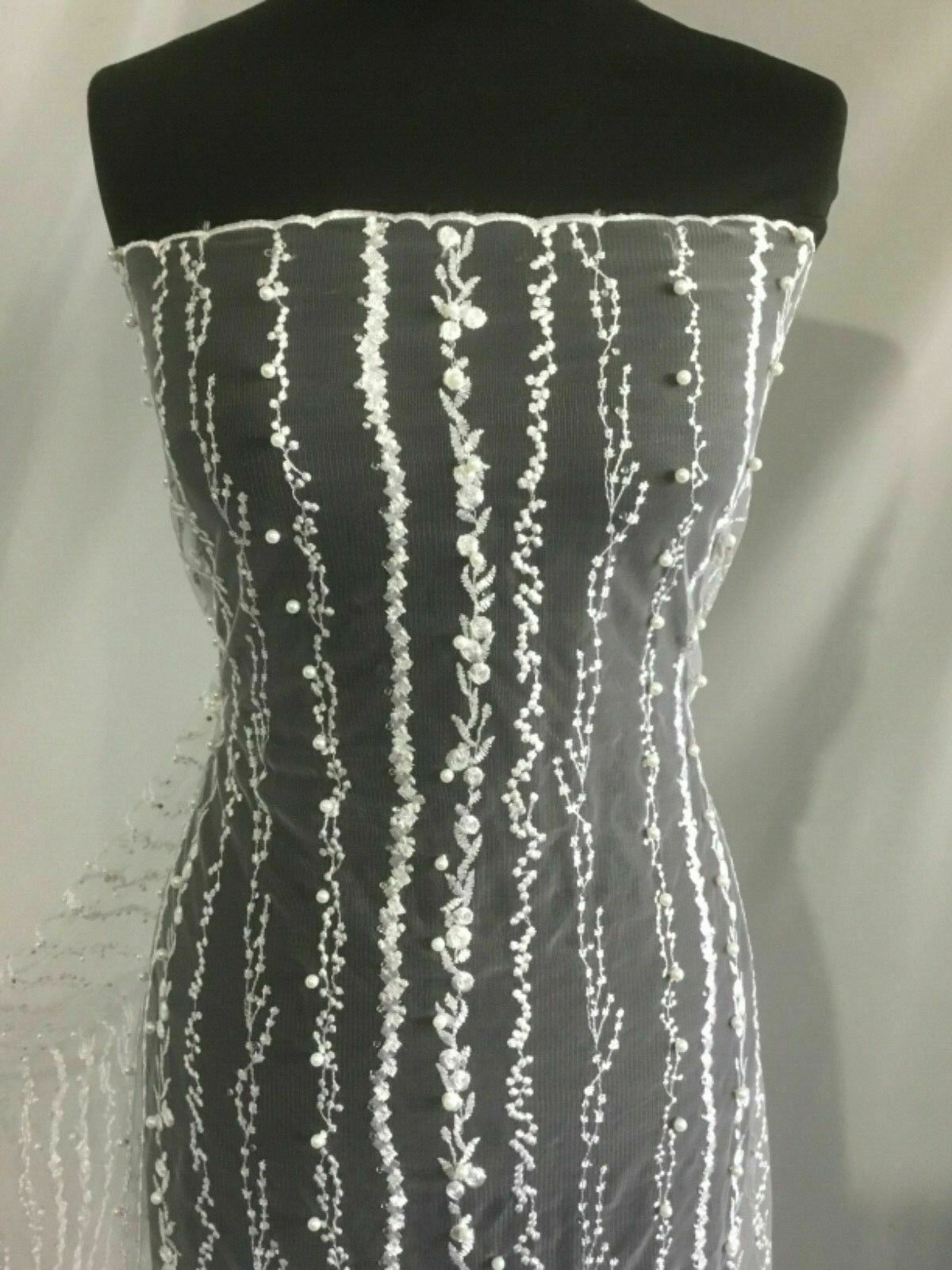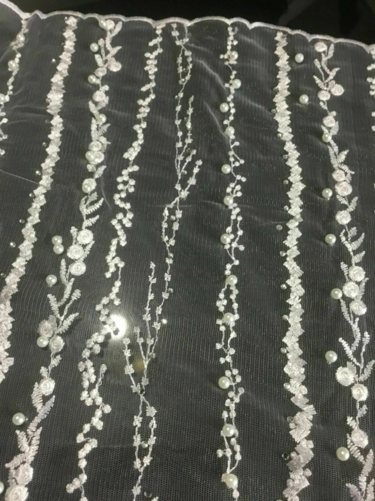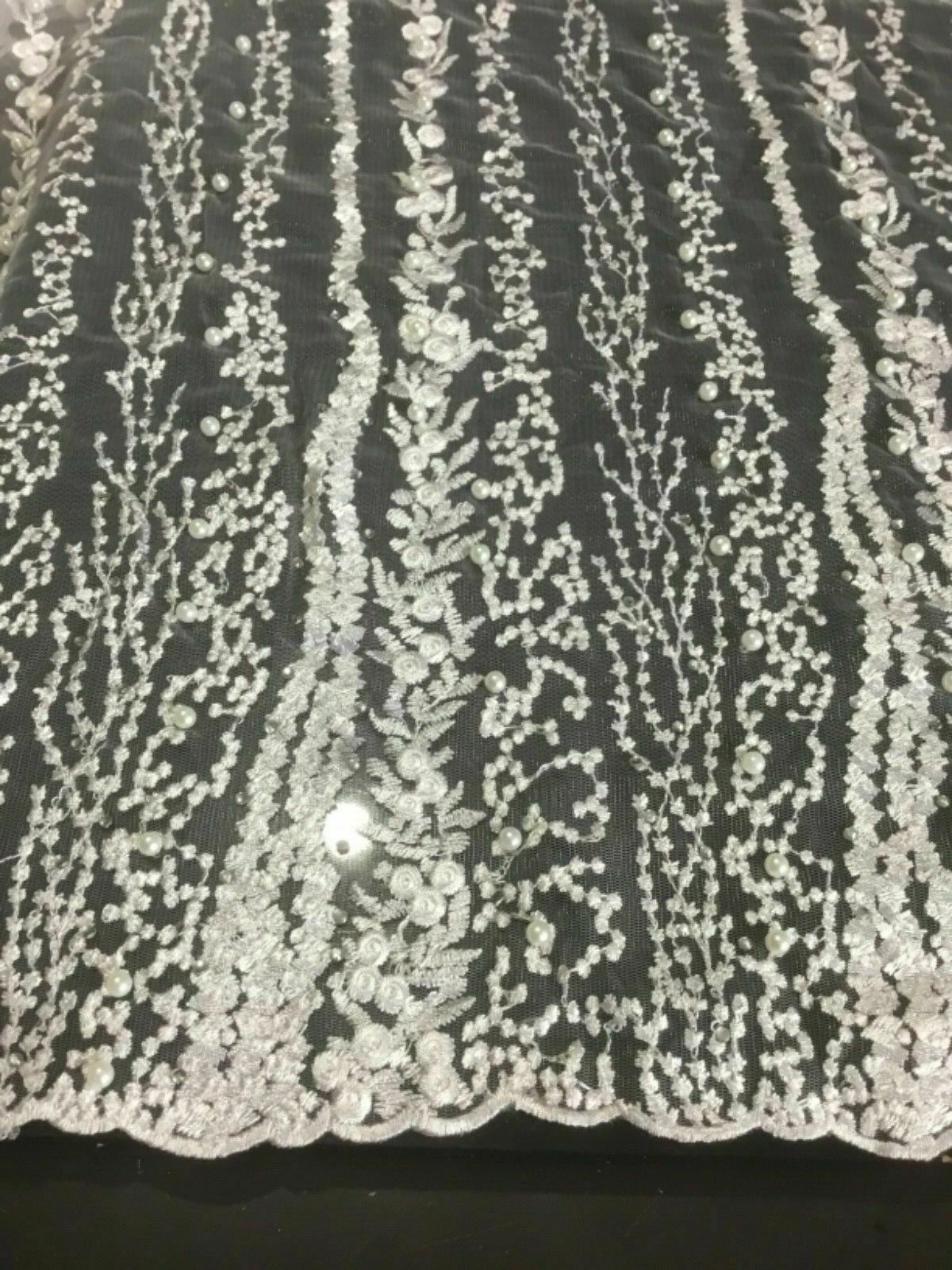 NEW HIGH CLASS DESIGNER ICED WHITE BRIDAL BORDER FLORAL PEARL LACE FABRIC 47”